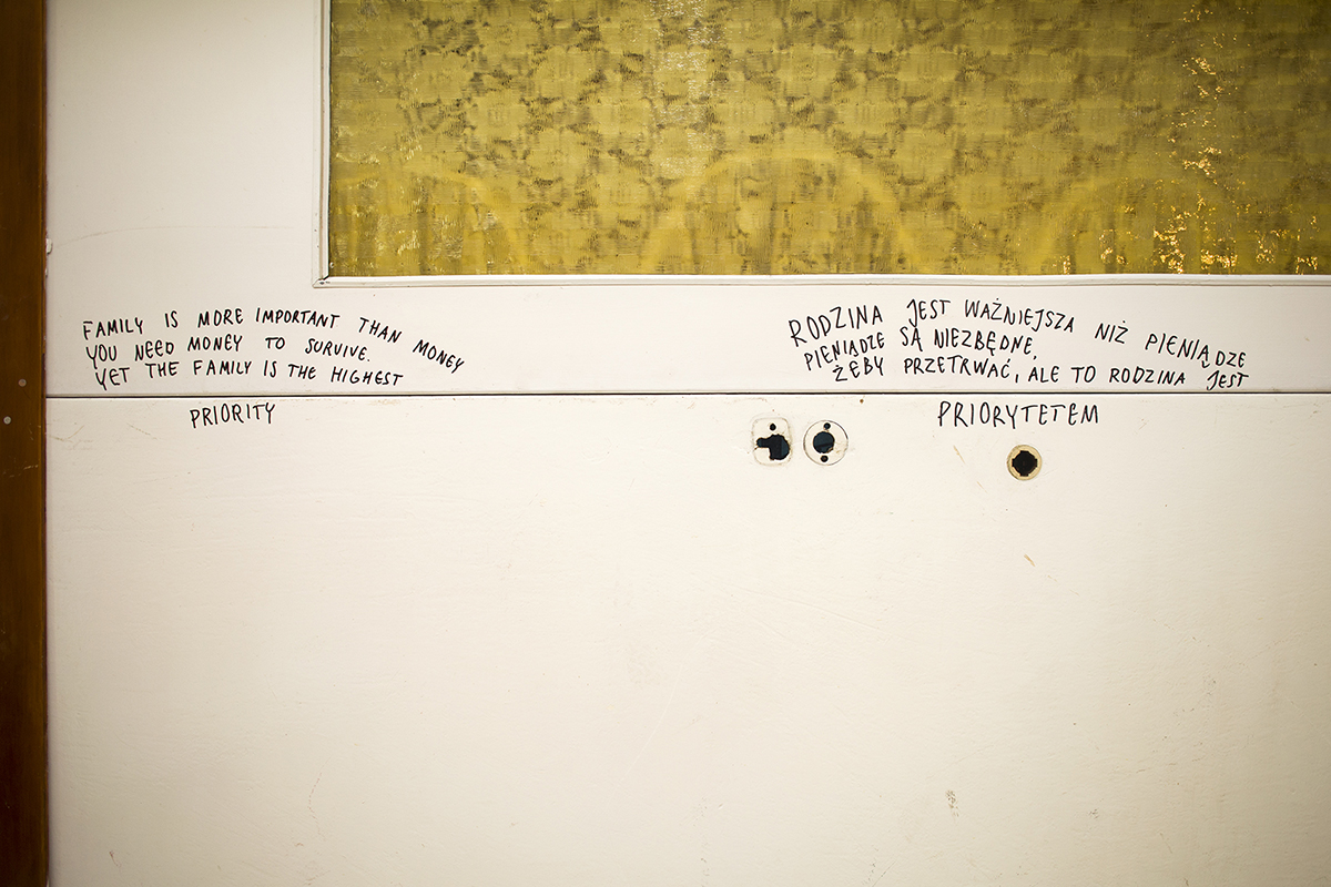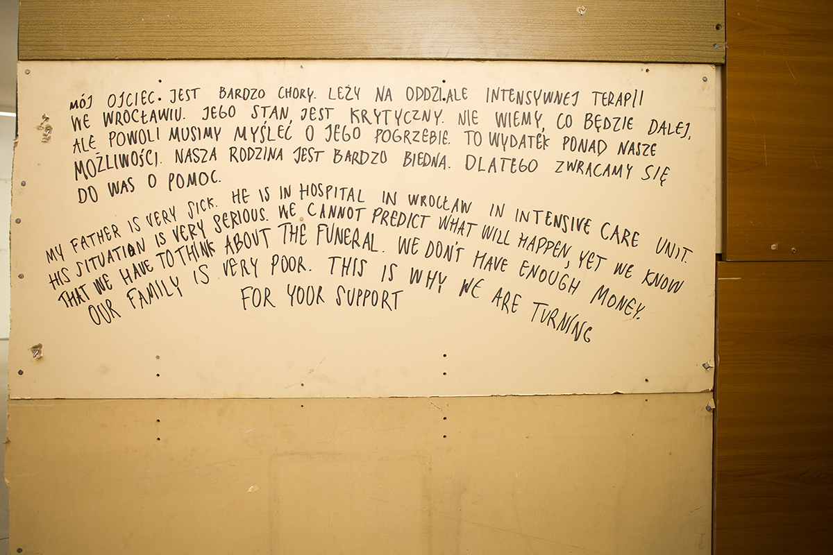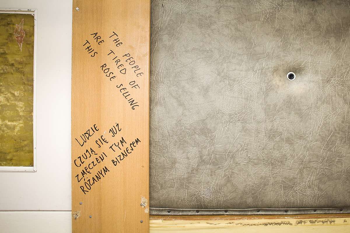 #YOUAREAROSE is about them. Who are these people selling roses? Why are they doing this? How do they live? Together with some of the men selling roses a house is built in Barbara, like the barracks these people live in, here in Wroclaw. Questions and thoughts related to rose selling are written on the barrack. The interior of the barrack is nicely decorated by some female rose sellers. Inside the barrack a simple table carries a vase, in it a single red rose.